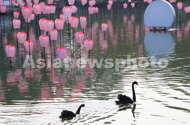 2024年1月2日,虽受新年伊始冷空气影响的古城苏州寒气袭人,但午后晴日暖阳下的该市盘门景区放生河塘内,一只只黑天鹅、大白鹅在装点新年喜气的一盏盏“孔明灯”中往返穿梭,戏水游弋,美如画景。
