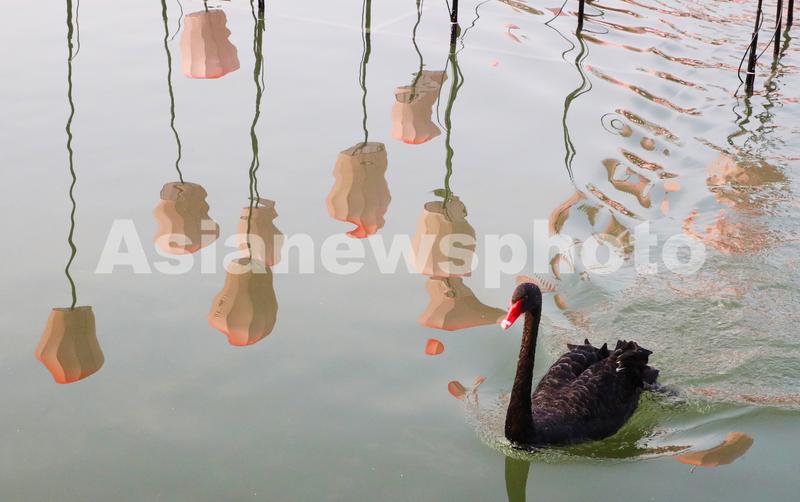 2024年1月2日,虽受新年伊始冷空气影响的古城苏州寒气袭人,但午后晴日暖阳下的该市盘门景区放生河塘内,一只只黑天鹅、大白鹅在装点新年喜气的一盏盏“孔明灯”中往返穿梭,戏水游弋,美如画景。