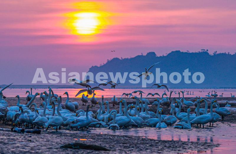 山东荣成:天鹅映朝霞 生态美如画 查看组图
