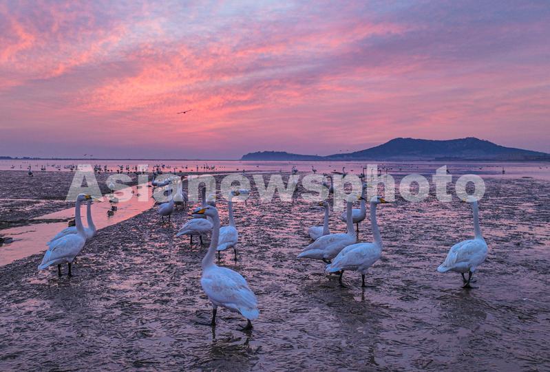 山东荣成:天鹅映朝霞 生态美如画 查看组图