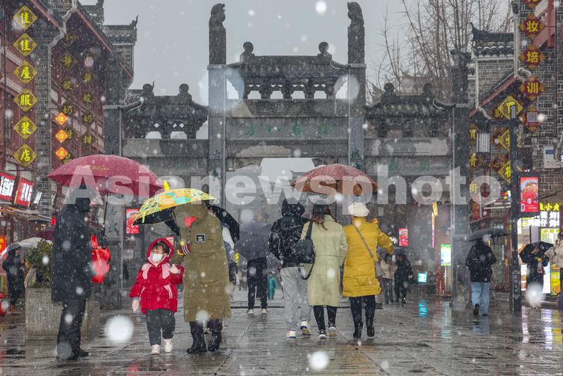 图片说明:2024年1月18日,湖北省襄阳市迎来降雪,市民和游客在襄阳古城北街的雪中行走。