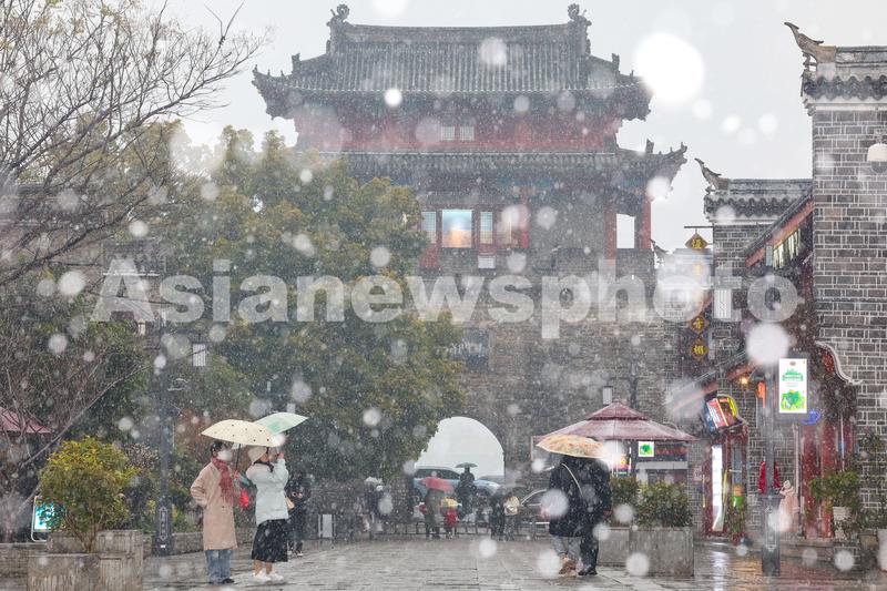 图片说明:2024年1月18日,湖北省襄阳市迎来降雪,市民和游客在襄阳古城北街的雪中行走。
