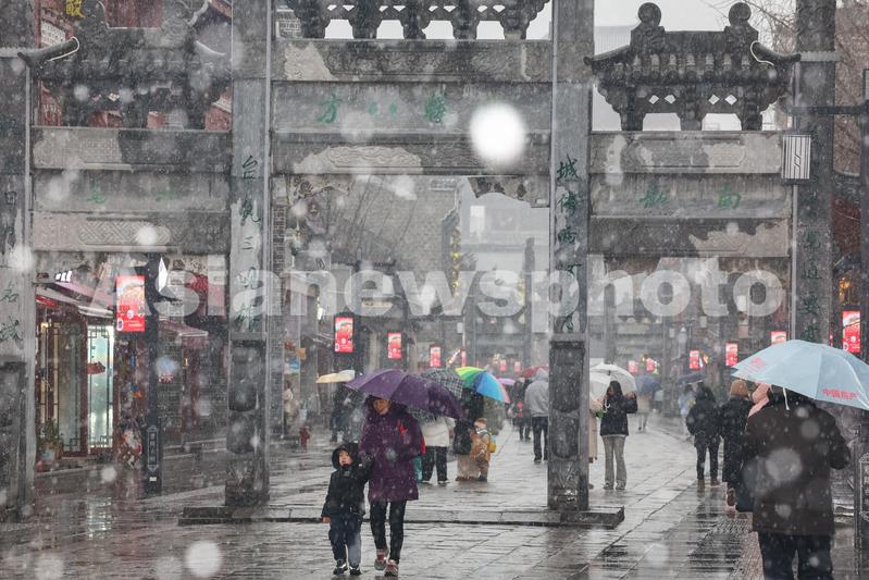 图片说明:2024年1月18日,湖北省襄阳市迎来降雪,市民和游客在襄阳古城北街的雪中行走。