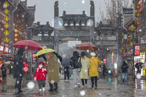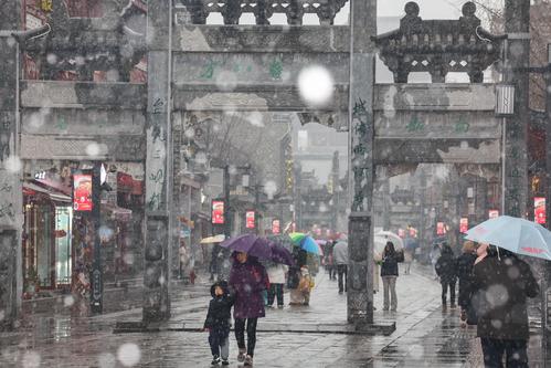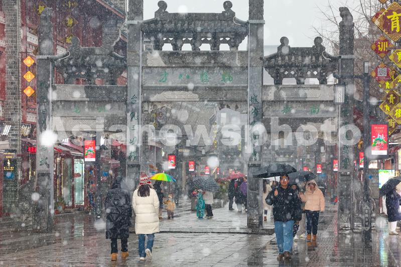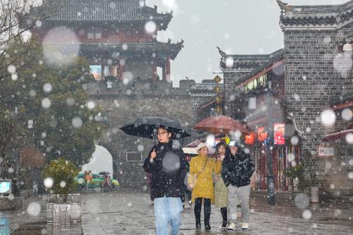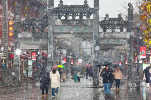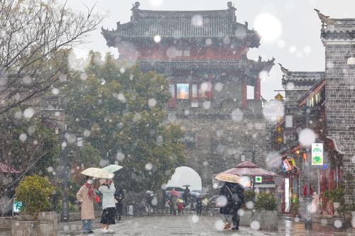 图片说明:2024年1月18日,湖北省襄阳市迎来降雪,市民和游客在襄阳古城北街的雪中行走。