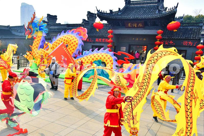 2024年1月29日,在江苏省如皋市水绘园风景区,彩带龙爱好者为游客表演舞龙。