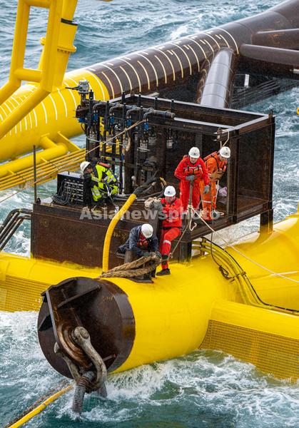 2024年1月29日,“深海一号”二期工程项目导管架滑移下水后,湿拖至起吊船“蓝鲸7500”船头,人员正在把“蓝鲸7500”上的控制缆绳连接到导管架带缆桩上。