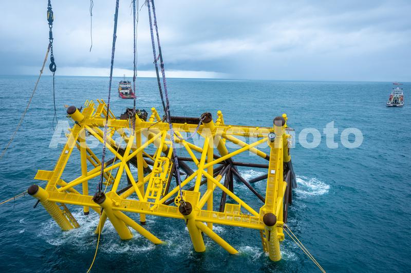 2024年1月29日,“深海一号”二期工程项目导管架挂好扶正索具,正在进行注水扶正作业。