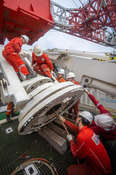 2024年1月27日,在“蓝鲸7500”起重工程船上,rov班组的技术人员在为测试水下机器人的压力做准备。