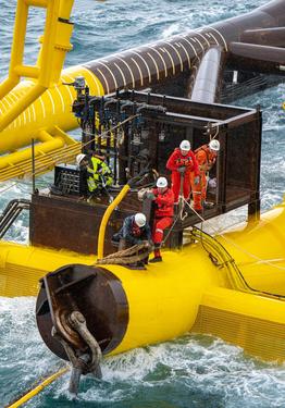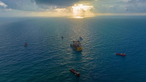据悉,“深海一号”二期工程导管架海上安装采用滑移下水方式进行。这种方式是利用导管架自身重力并配合液压千斤顶助推,使导管架从驳船平稳地滑入海中,再通过起重船将导管架吊装扶正坐底,从而实现安装就位。