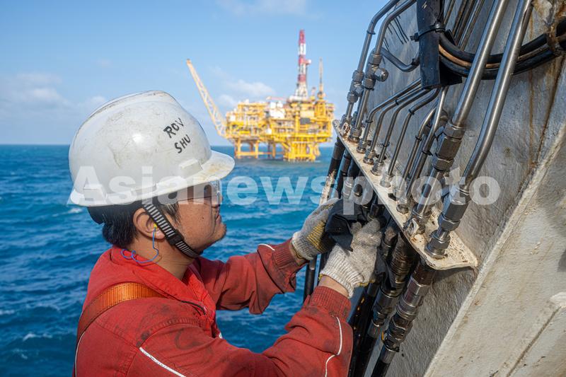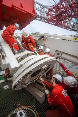 2024年1月28日,在“蓝鲸7500”起重工程船机舱,ROV班组技术人员检查水下机器人设备。
