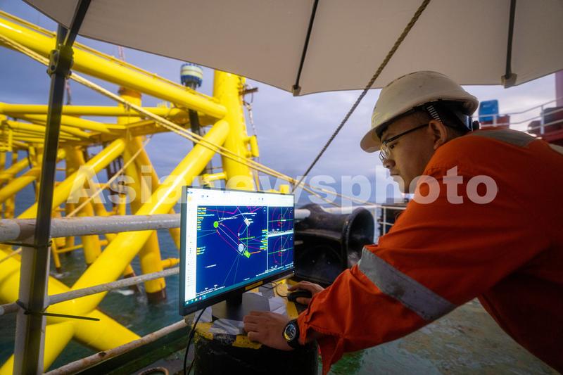 2024年1月29日,在“蓝鲸7500”起重工程船上,定位组的杨朋朋正在测量的导管架实时定位坐标,确定导管架的就位信息。