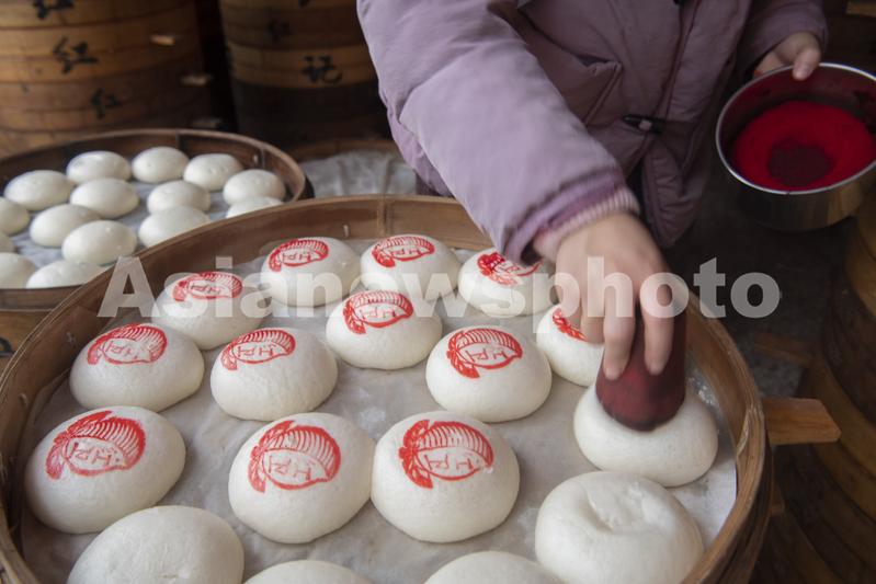 图片说明:2024年2月4日,浙江省金华市婺城区新狮街道下裴村一馒头店,店主在刚出笼的馒头盖上红印。