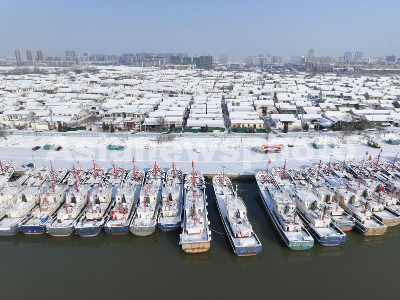 2024年2月5日,在江苏省连云港市赣榆区青口中心渔港雪景雪景。