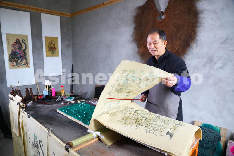 图片说明:2024年2月6日,重庆市梁平区屏锦镇,国家级非物质文化遗产梁平木版年画第六代传承人徐家辉在印刷梁平木版年画。