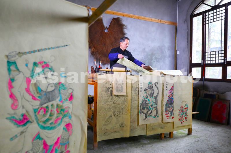 图片说明:2024年2月6日,重庆市梁平区屏锦镇,国家级非物质文化遗产梁平木版年画第六代传承人徐家辉在印刷梁平木版年画。