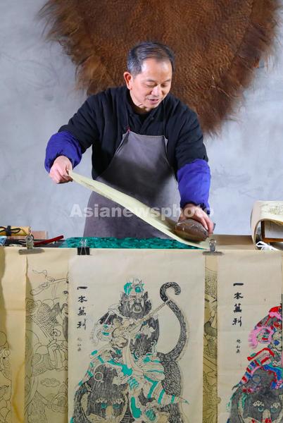 图片说明:2024年2月6日,重庆市梁平区屏锦镇,国家级非物质文化遗产梁平木版年画第六代传承人徐家辉在印刷梁平木版年画。