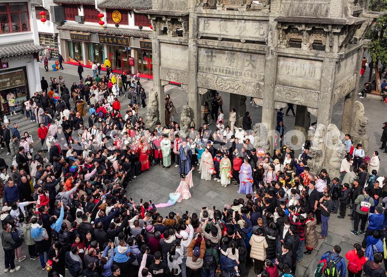 2024年2月13日,安徽省黄山市歙县,众多游客在徽州古城观看汉服走秀表演。(无人机照片)