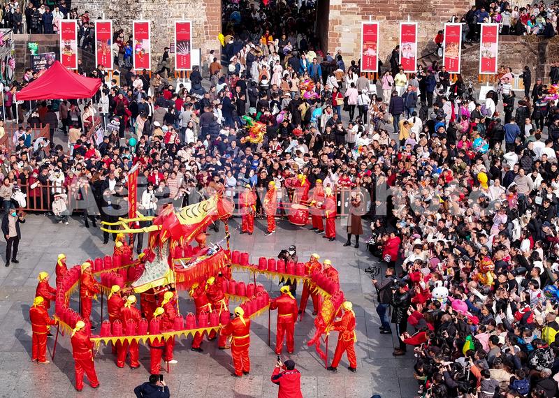 2024年2月13日,安徽省黄山市歙县,众多游客在徽州古城观赏民俗板凳龙表演。(无人机照片)