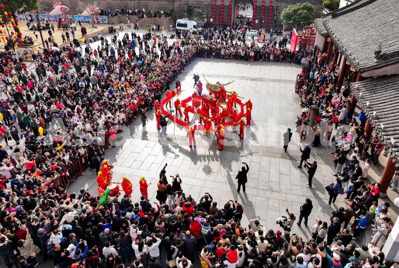 2024年2月13日,安徽省黄山市歙县,众多游客在徽州古城观赏民俗板凳龙表演。(无人机照片)