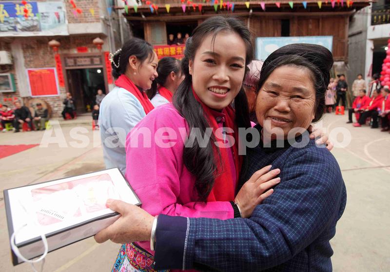 图片说明:2024年2月13日,在广西柳州市融水苗族自治县洞头镇洞头村,外嫁女(左)向娘家老人代表赠送礼物后与老人相拥。