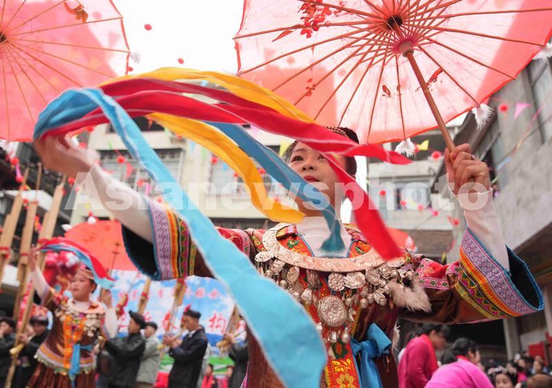 图片说明:2024年2月13日,在广西柳州市融水苗族自治县洞头镇洞头村,娘家姑娘载歌载舞迎接外嫁女回娘家。