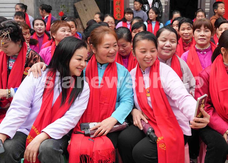 图片说明:2024年2月13日,在广西柳州市融水苗族自治县洞头镇洞头村,几位外嫁女合影留念。