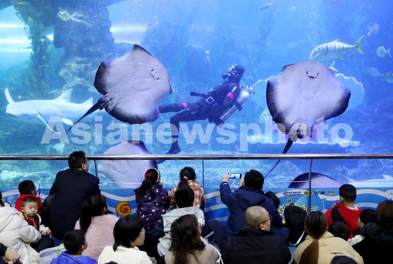2月12日,在青岛海底世界,潜水员和水族们在水下共舞新春。