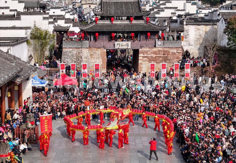 2024年2月13日,安徽省黄山市歙县,众多游客在徽州古城观赏民俗板凳龙表演。(无人机照片)