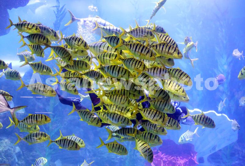 2月12日,在青岛海底世界,潜水员和水族们在水下共舞新春。