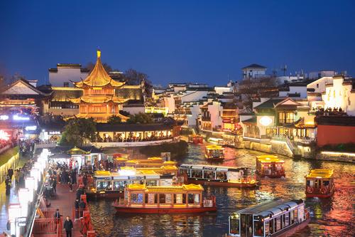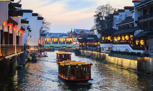 2月14日,游人在南京夫子庙景区赏灯游览。