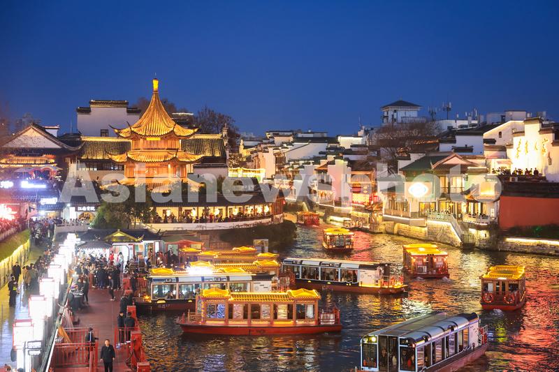 2月14日,游人在南京夫子庙景区乘坐游船赏灯游览。