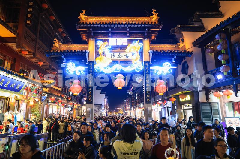 2月14日,游人在南京夫子庙景区赏灯游览。