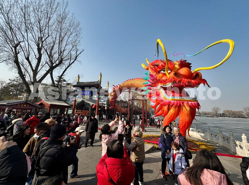 图片说明:2月12日,悬挂在什刹海畔荷花市场上空的“蛟龙出海”巨型龙灯吸引众多市民游客。