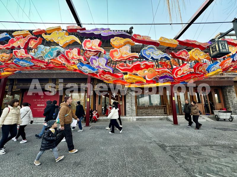 图片说明:2月12日,悬挂在什刹海畔荷花市场上空的“蛟龙出海”巨型龙灯吸引众多市民游客。