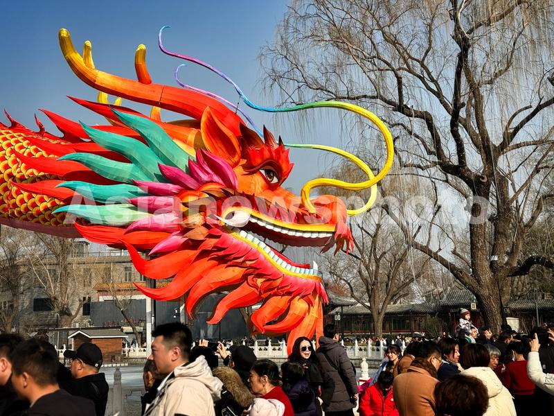 图片说明:2月12日,悬挂在什刹海畔荷花市场上空的“蛟龙出海”巨型龙灯吸引众多市民游客。