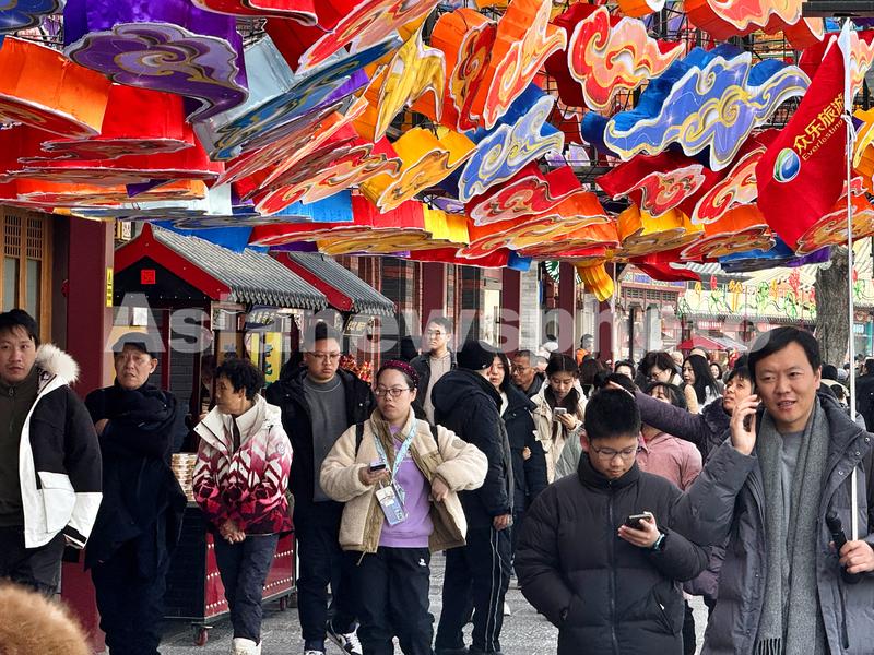 图片说明:2月12日,悬挂在什刹海畔荷花市场上空的“蛟龙出海”巨型龙灯吸引众多市民游客。