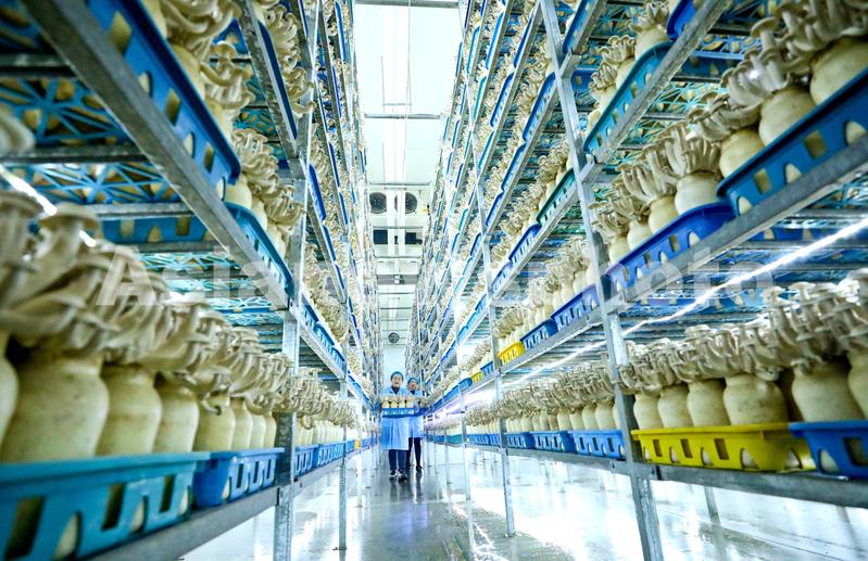 图片说明:2024年2月18日,位于甘肃省张掖市甘州区巴吉滩工业园区内,甘肃神农珍稀菇业出菇房里,工作人员正在将成熟的鹿茸菇搬运出菇房。