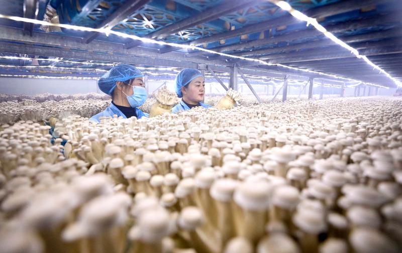 图片说明:2024年2月18日,位于甘肃省张掖市甘州区巴吉滩工业园区内,甘肃神农菇业工作人员正在鹿茸菇生产菇房内查看鹿茸菇生长情况。