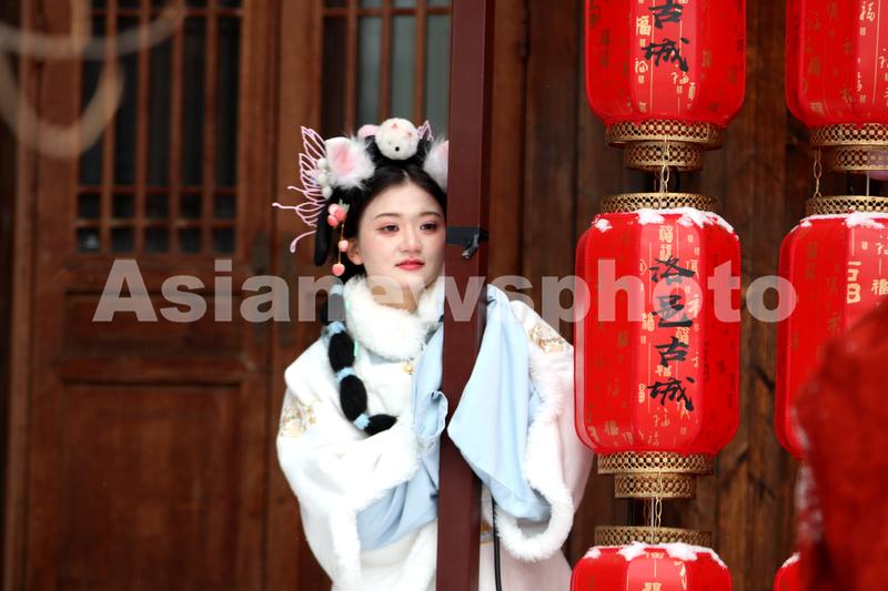 图片说明:2024年2月21日,一位身着汉服的姑娘在河南省洛阳市洛邑古城拍照。