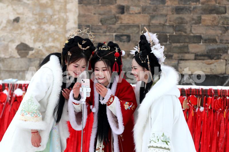 图片说明:2024年2月21日,来自江苏徐州市的三位姑娘在河南省洛阳市洛邑古城欣赏自己拍的抖音。