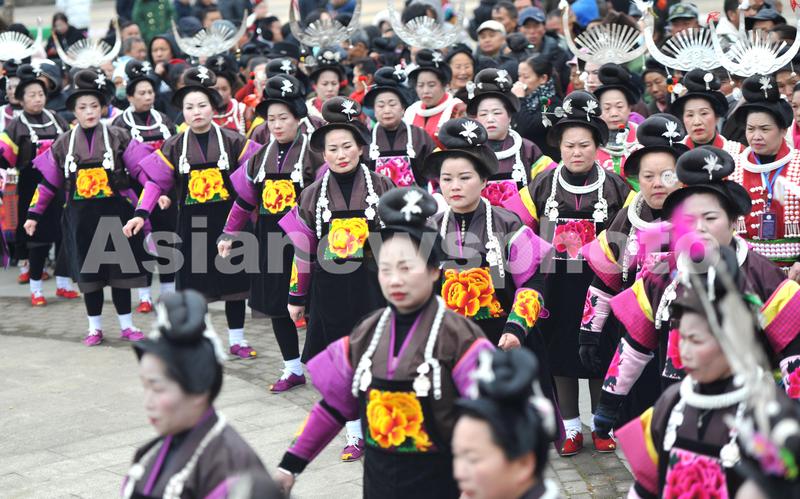 图片说明:2024年2月26日,苗族同胞在贵州省凯里市舟溪镇参加甘囊香芦笙比赛。