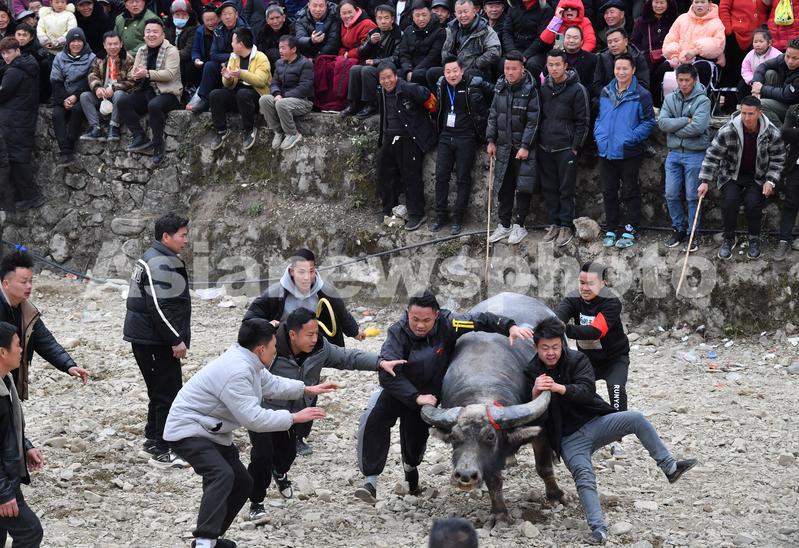 图片说明:2024年2月29日,贵州省黔东南苗族侗族自治州凯里市舟溪甘囊香芦笙节斗牛比赛中,苗族斗牛手在制服斗牛。