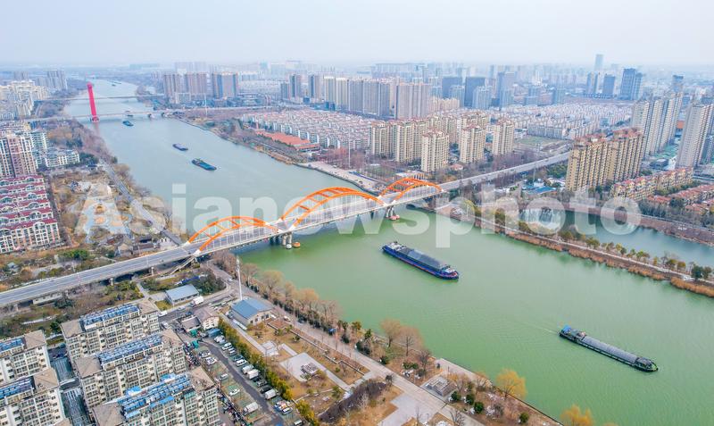 图片说明:2024年3月1日,在江苏省宿迁市宿城区段的京杭大运河上,装运生产和生活物资的货运船舶往返穿梭。