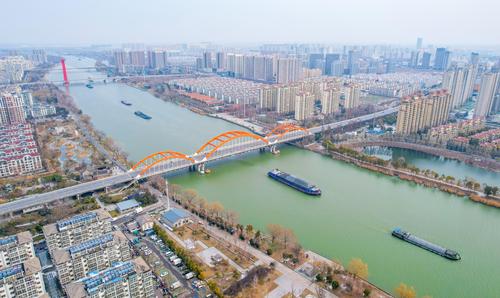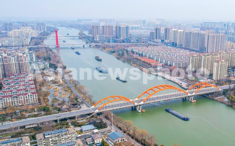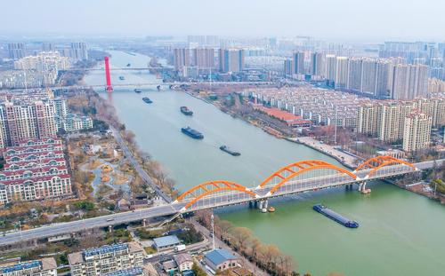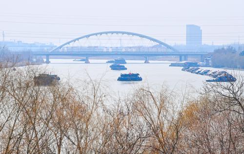 图片说明:2024年3月1日,在江苏省宿迁市宿城区段的京杭大运河上,装运生产和生活物资的货运船舶往返穿梭。