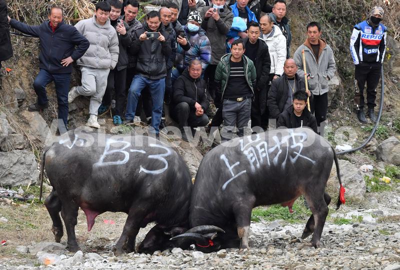 图片说明:2024年2月29日,贵州省黔东南苗族侗族自治州凯里市舟溪甘囊香芦笙节斗牛比赛现场。