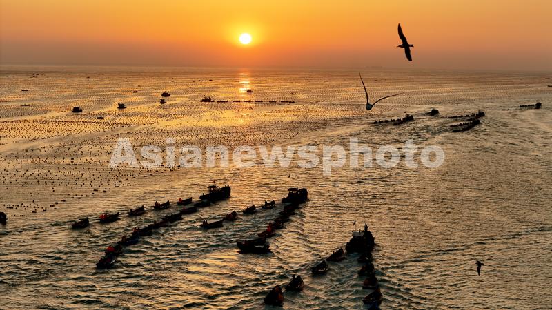 图片说明:2024年3月7日,山东省荣成市爱伦湾海洋牧场,养殖工人迎着朝阳驾驶养殖船穿梭于海带养殖区收割小海带。