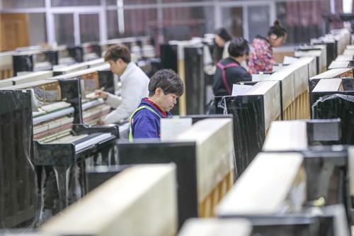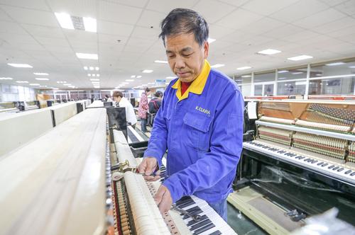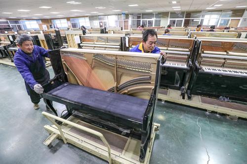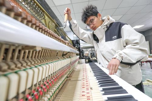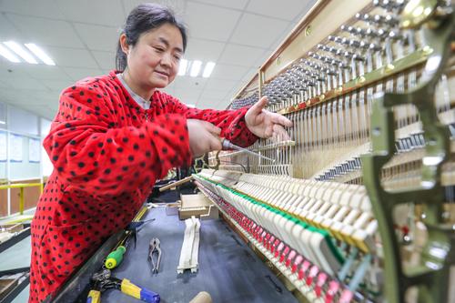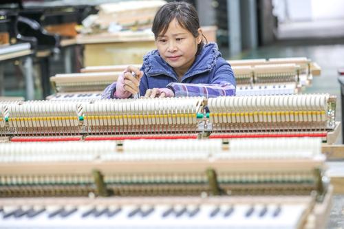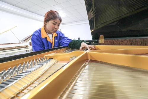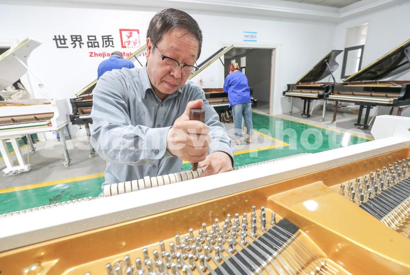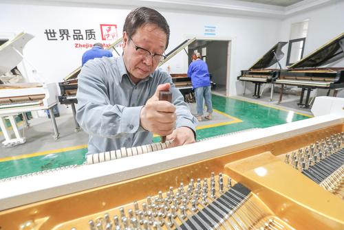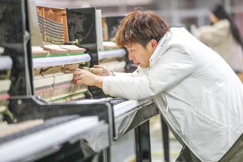 图片说明:2024年3月14日,在浙江省湖州市德清县洛舍镇东衡村钢琴小镇产业园乐韵钢琴有限公司,技术人员在对钢琴进行整音。