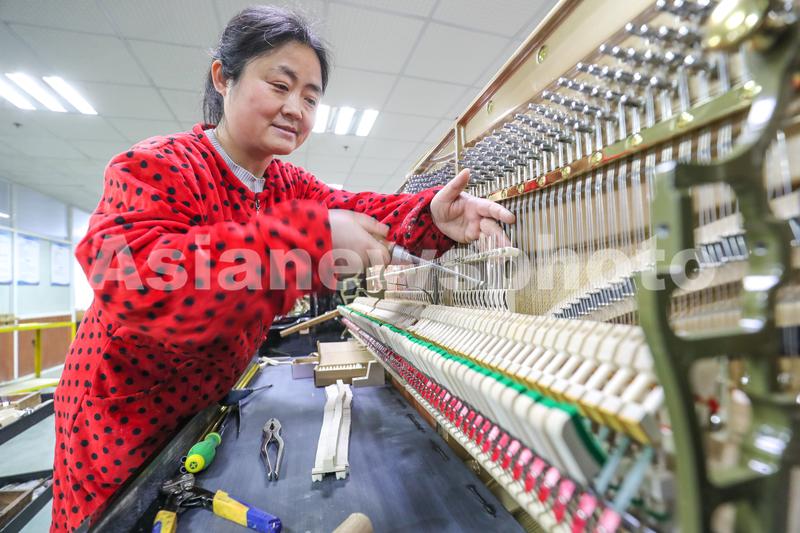 图片说明:2024年3月14日,在浙江省湖州市德清县洛舍镇东衡村钢琴小镇产业园乐韵钢琴有限公司,工人在装配钢琴。