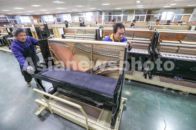 图片说明:2024年3月14日,在浙江省湖州市德清县洛舍镇东衡村钢琴小镇产业园乐韵钢琴有限公司,工人正在推运钢琴组件。