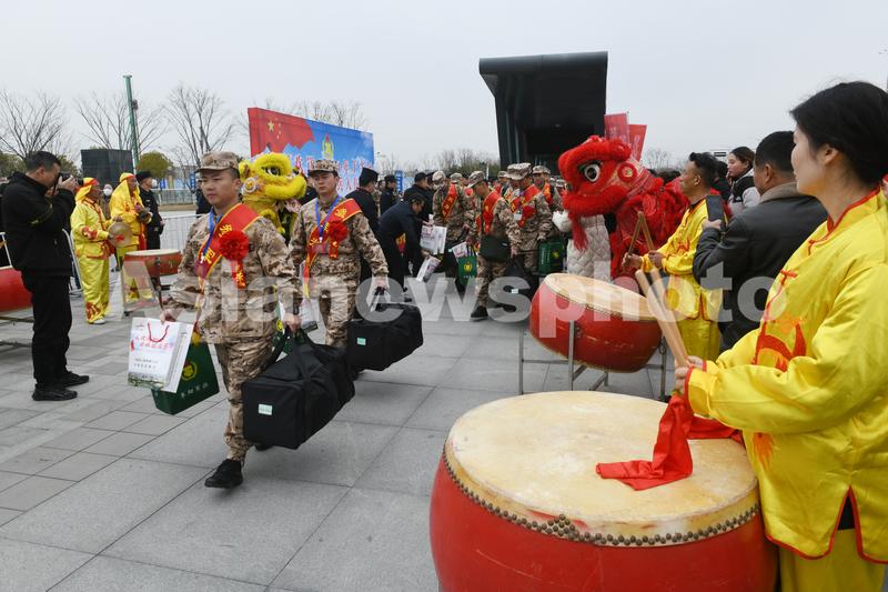 图片说明:2024年3月18日,在安徽省阜阳市2024年上半年新兵起运仪式现场,敲锣打鼓欢送新兵启程奔赴军营。